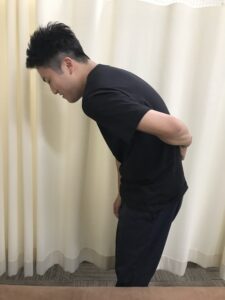 3. そのまま背中を丸めず、ゆっくりとお辞儀をするように体を前に倒します。
